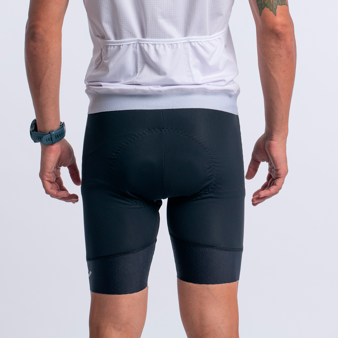 Calza ciclismo de hombre. Confeccionada en lycra, tela que proporciona a la prenda flexibilidad y ergonomía. Es una prenda ideal para el deporte ya que es resistente al sudor y seca rápidamente. Diseñamos una calza sin puño y sumamos, además, una badana gel-pad que protege la zona y evita rozaduras.